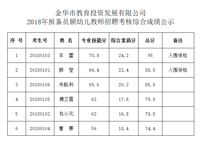 金華市教育投資發(fā)展有限公司2018年報(bào)備員額幼兒教師招聘考核綜合成績公示